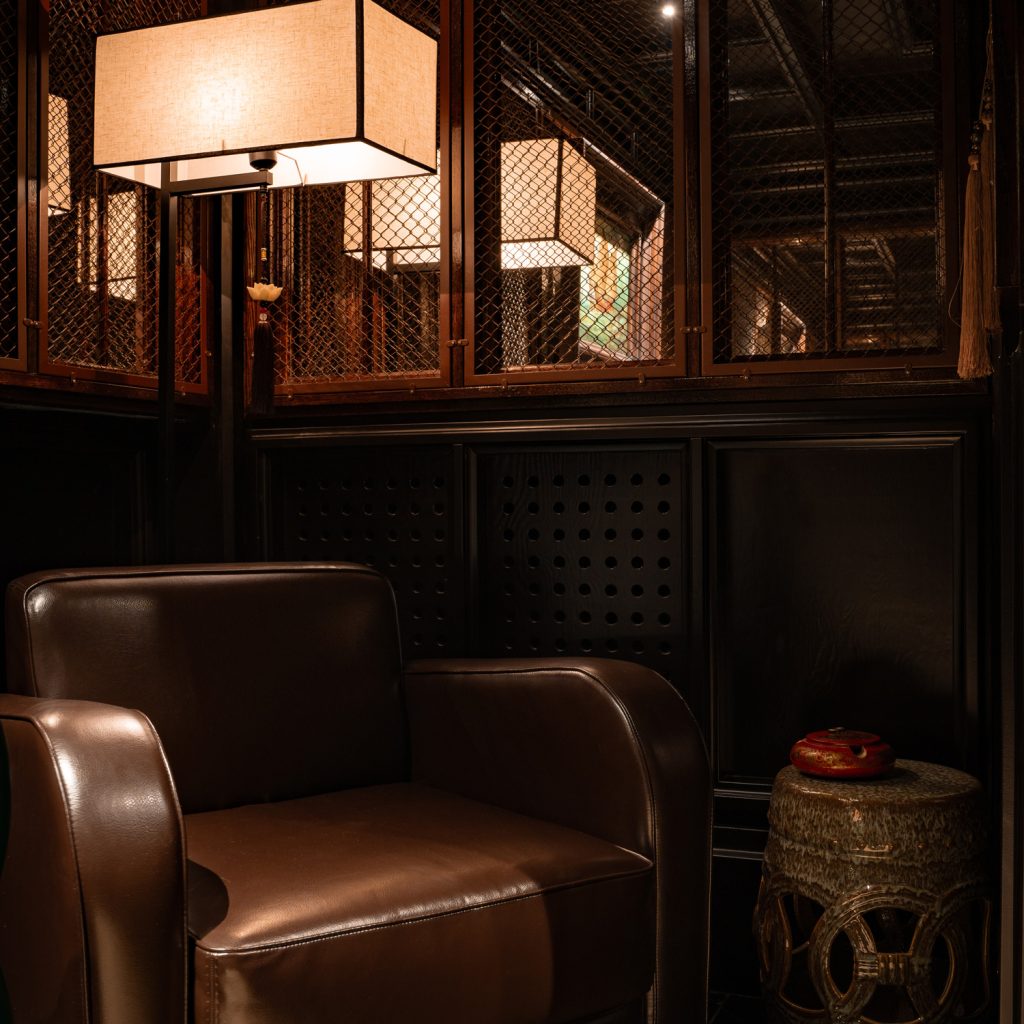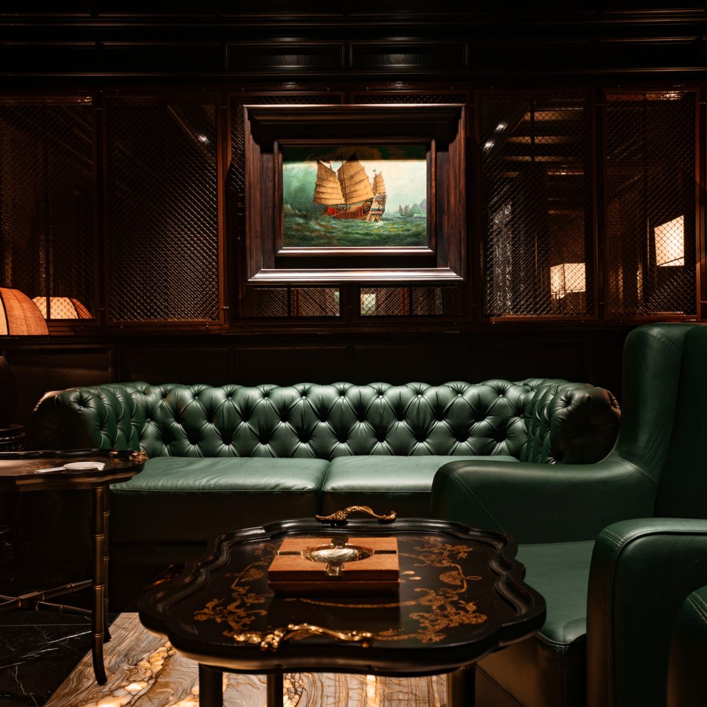 Представим, что мы оказываемся в Гонконге во время Второй опиумной войны, когда англичане аннексировали этот город. Это сигарная комната английского генерала, но, находясь не в Лондоне, а в Гонконге, мы замечаем множество элементов декора с китайских антикварных рынков: торшеры, фигурки драконов сигарные столики.
