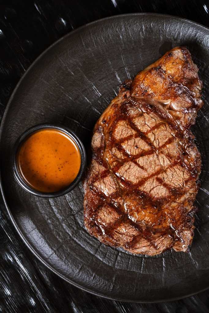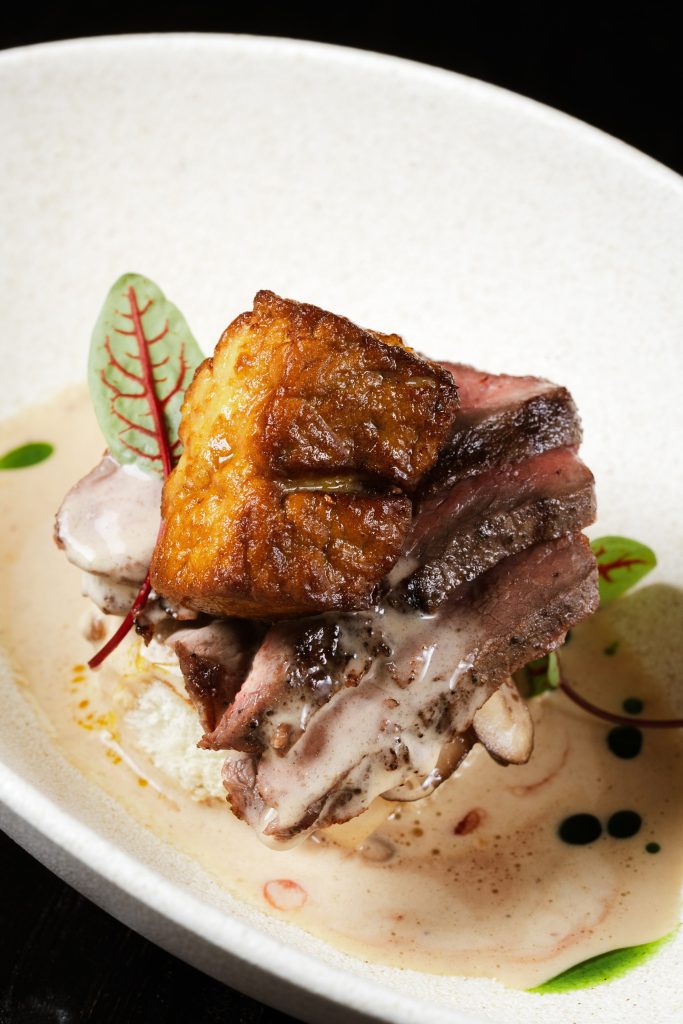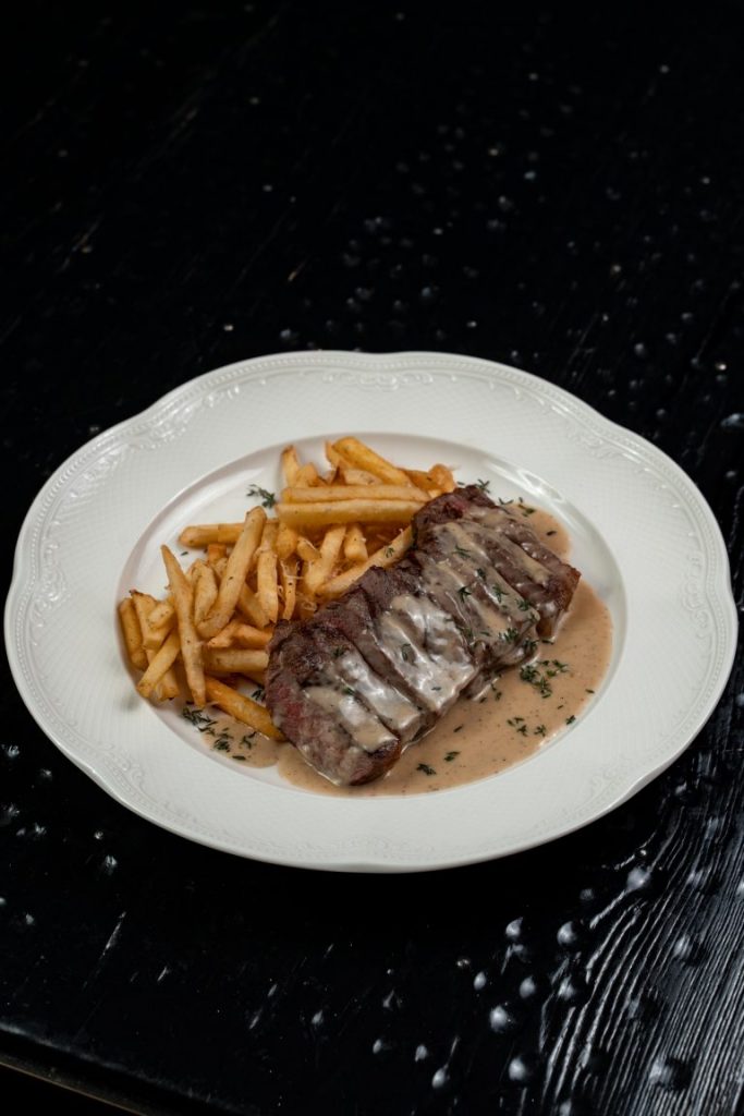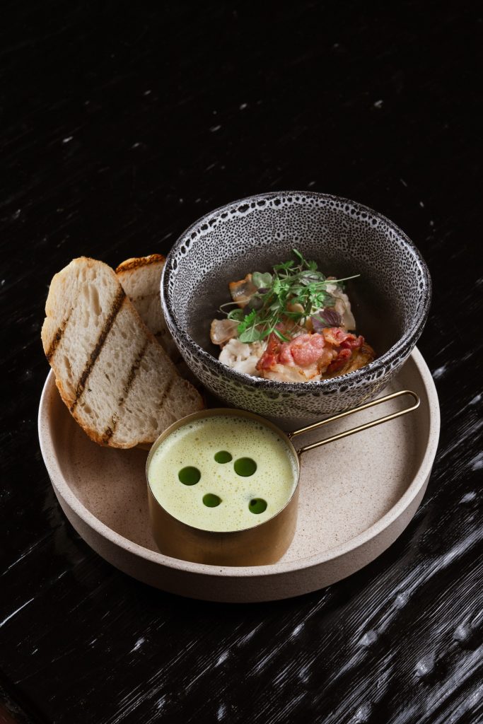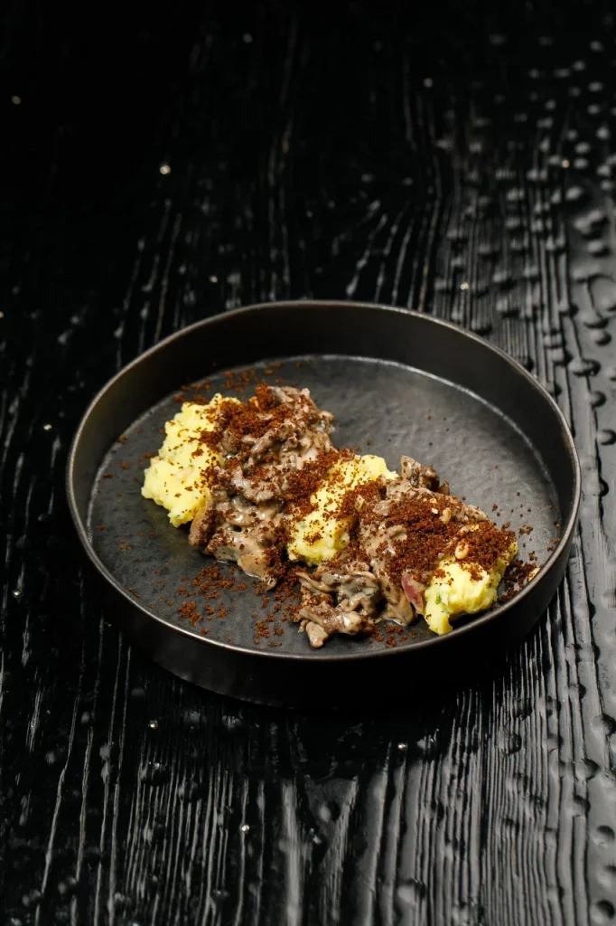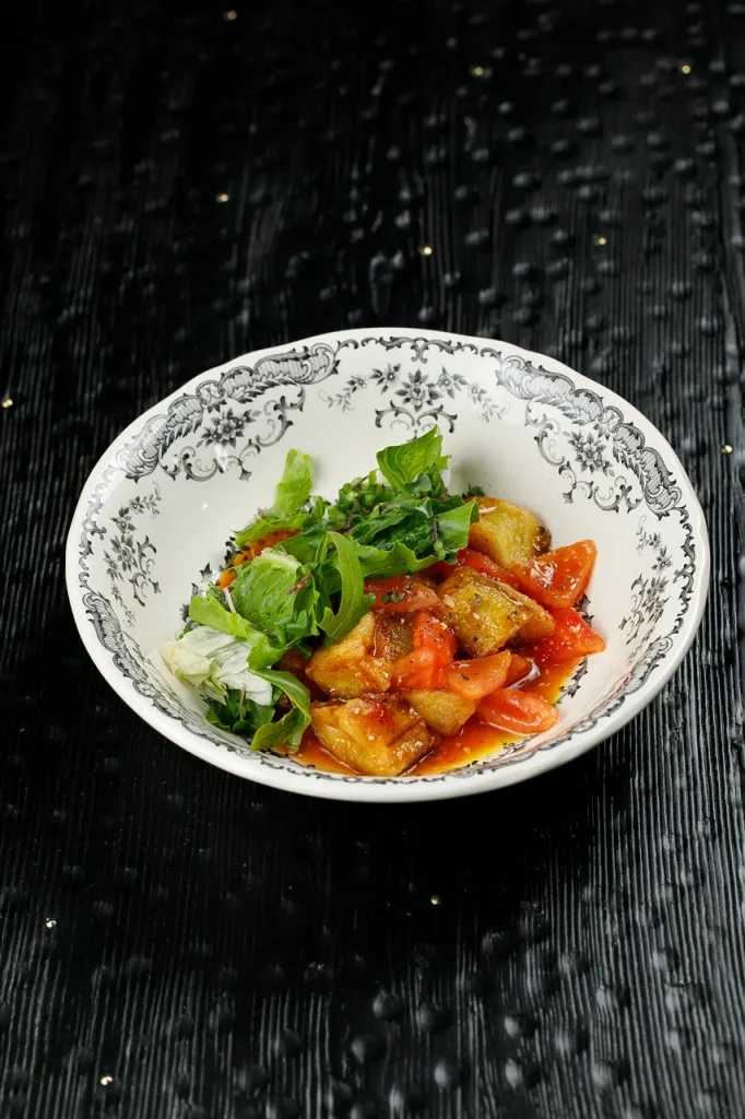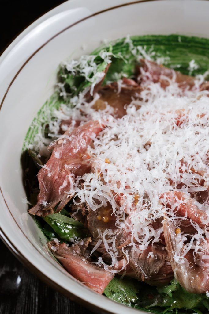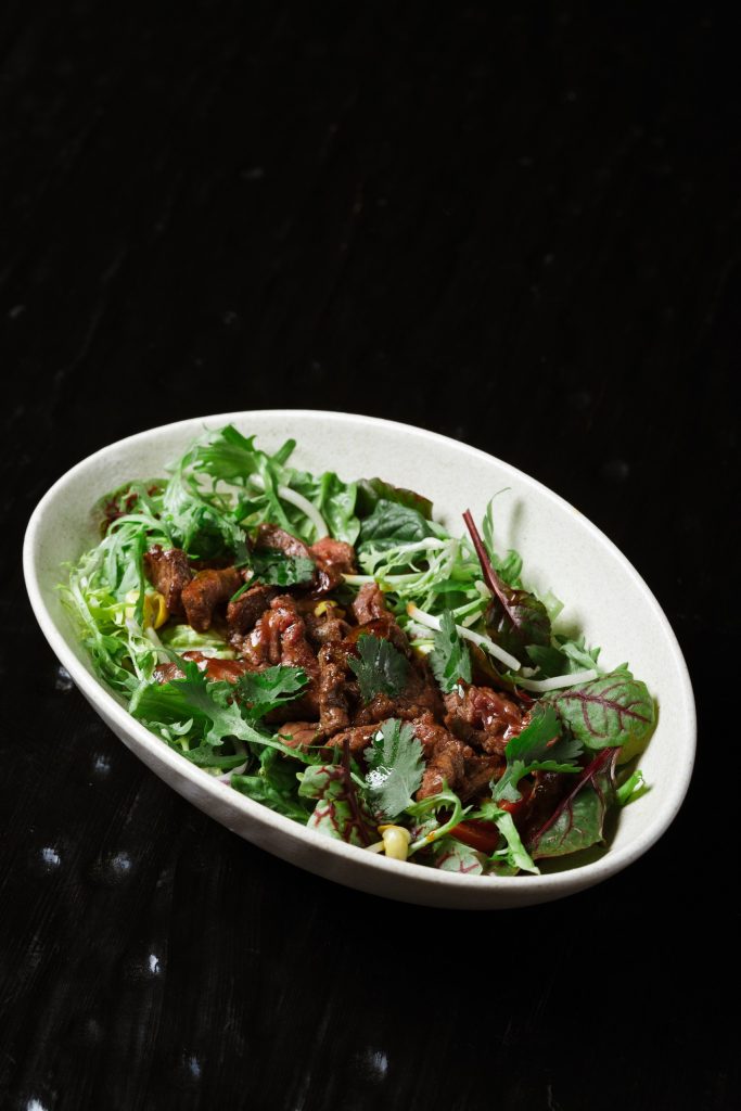 Мраморный стейк нарезается мелкими кубиками и заправляется имбирно-устричным дрессингом с зеленым луком. Блюдо посыпается тертым пармезаном и подается с домашней чиабаттой, обжаренной на гриле.