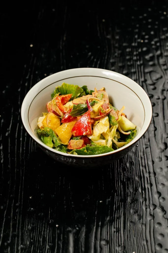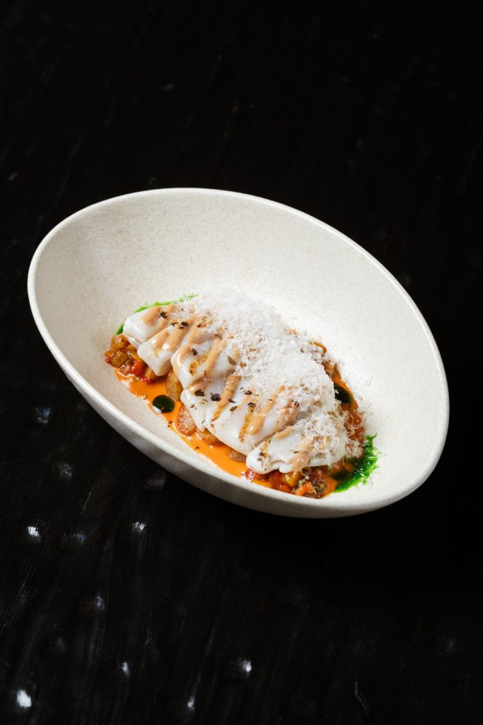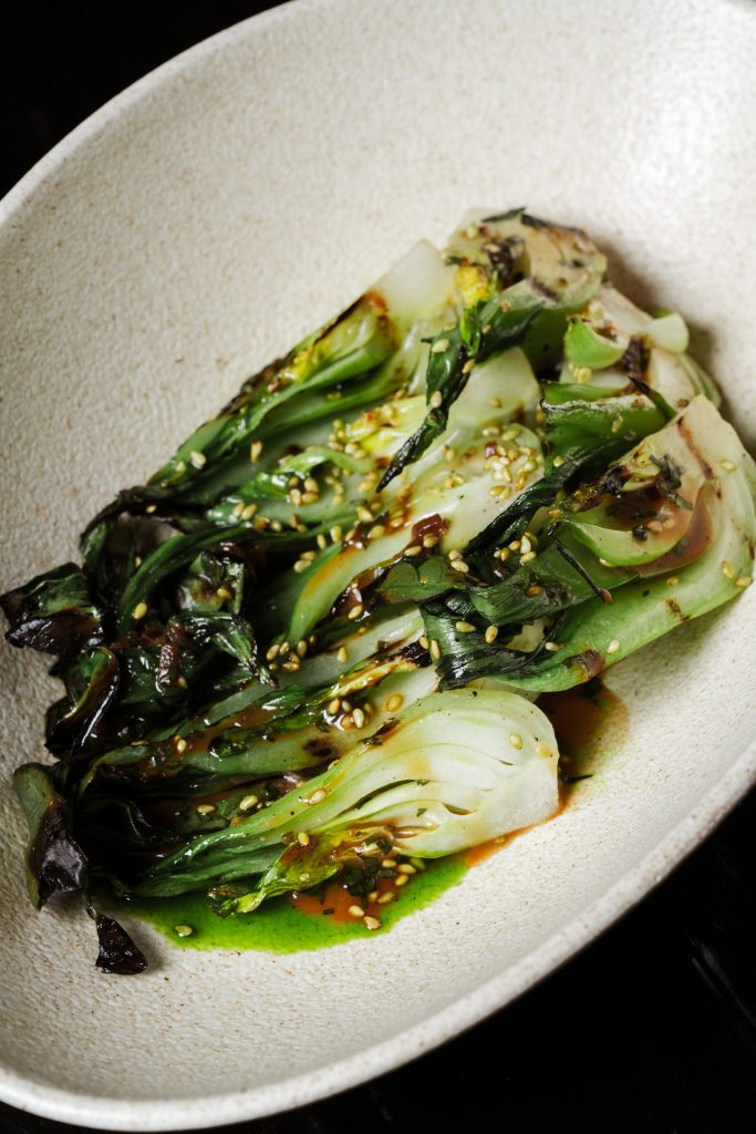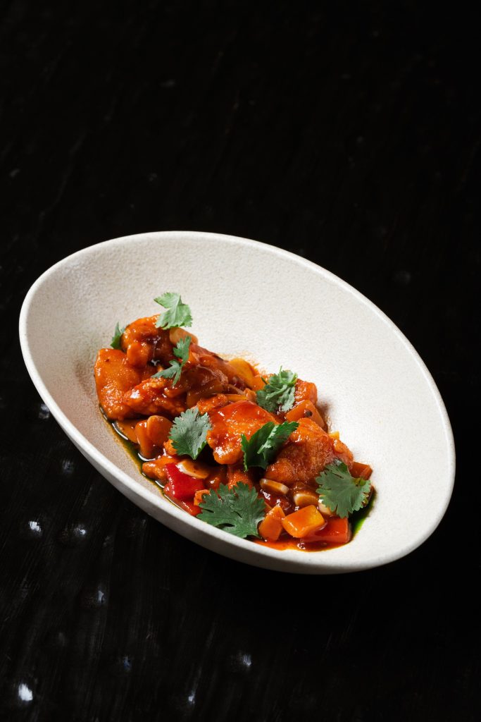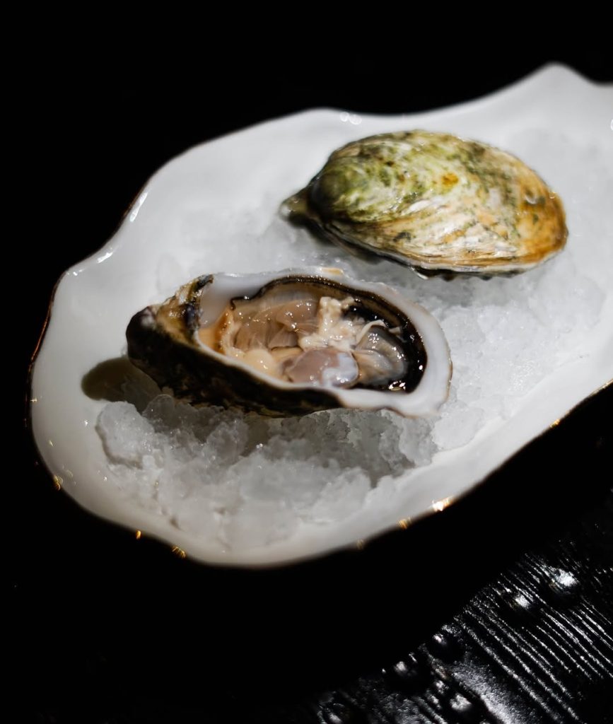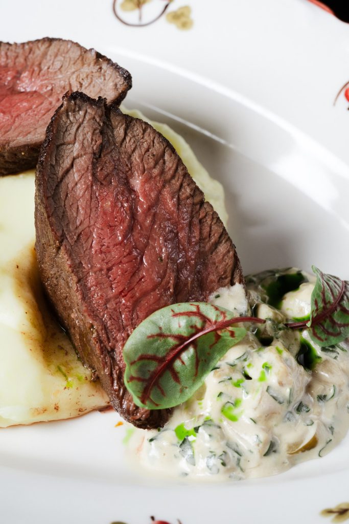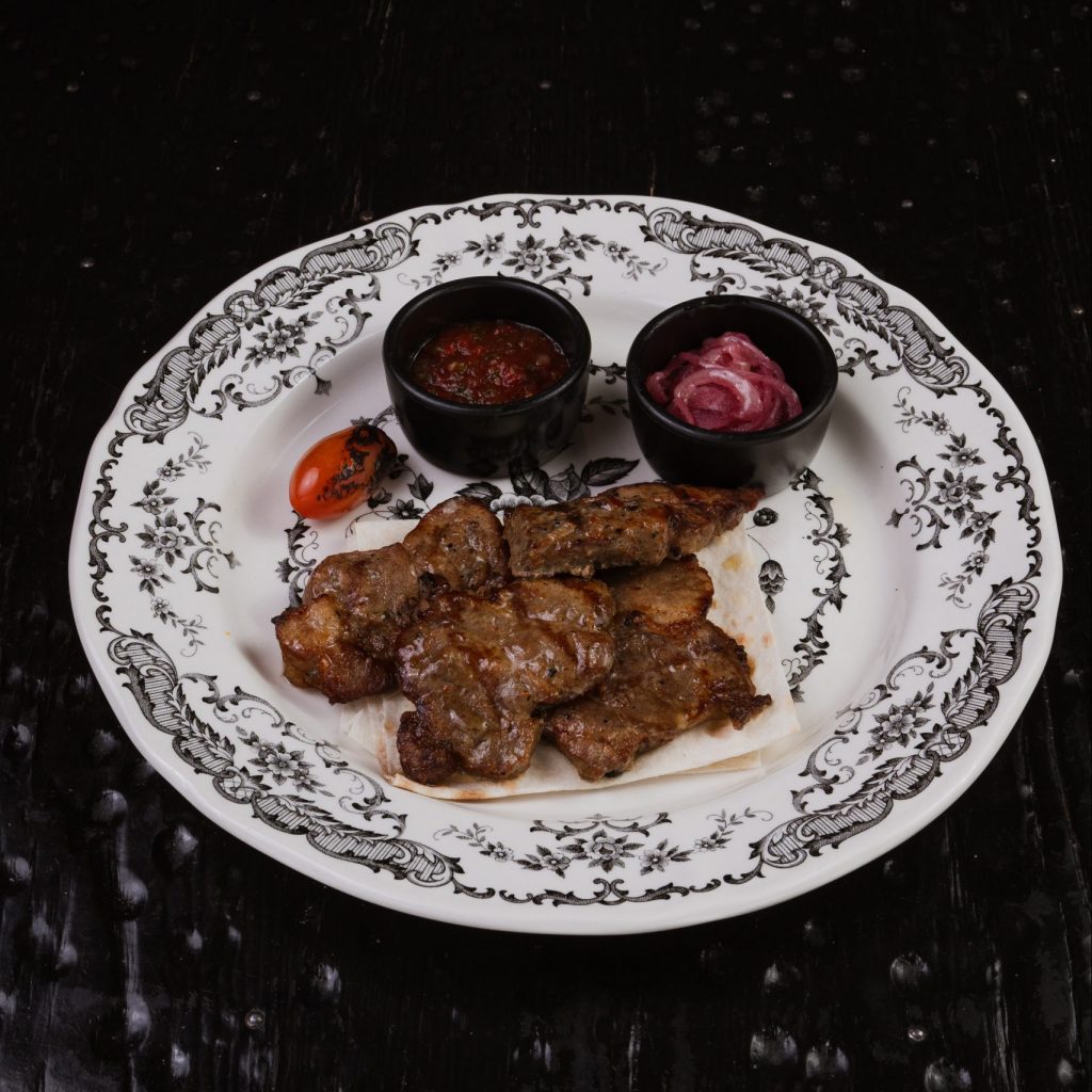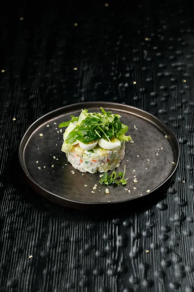 Мраморный стейк нарезается мелкими кубиками и заправляется имбирно-устричным дрессингом с зеленым луком. Блюдо посыпается тертым пармезаном и подается с домашней чиабаттой, обжаренной на гриле.
