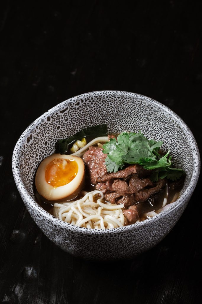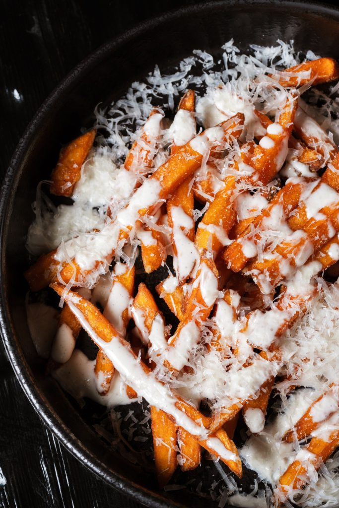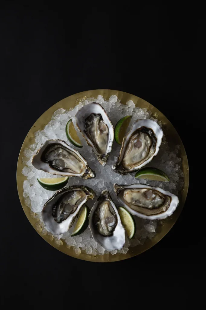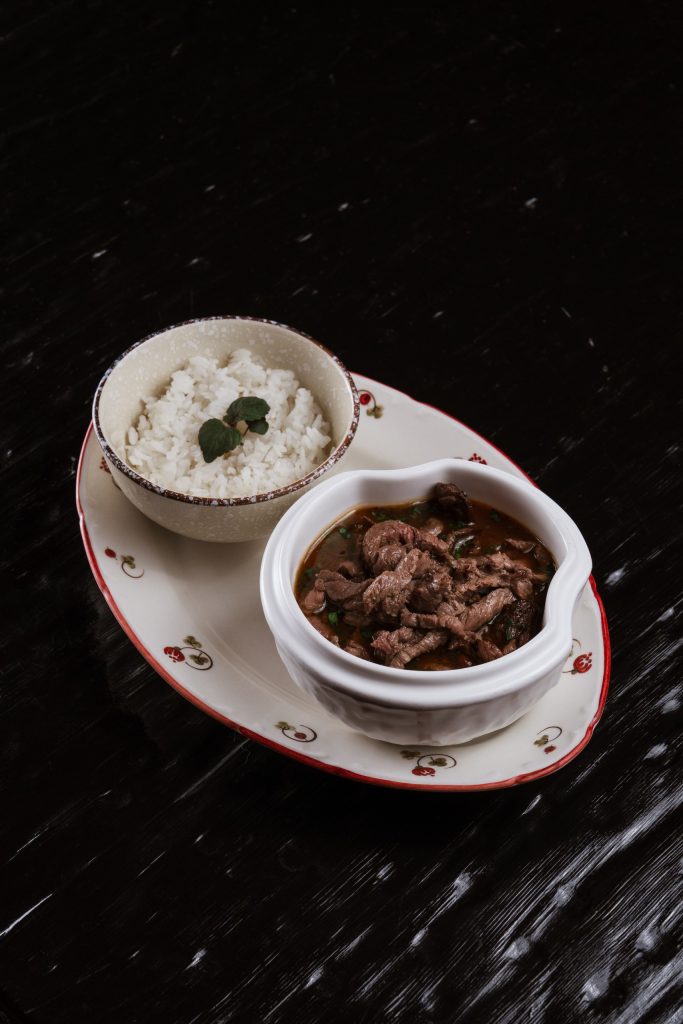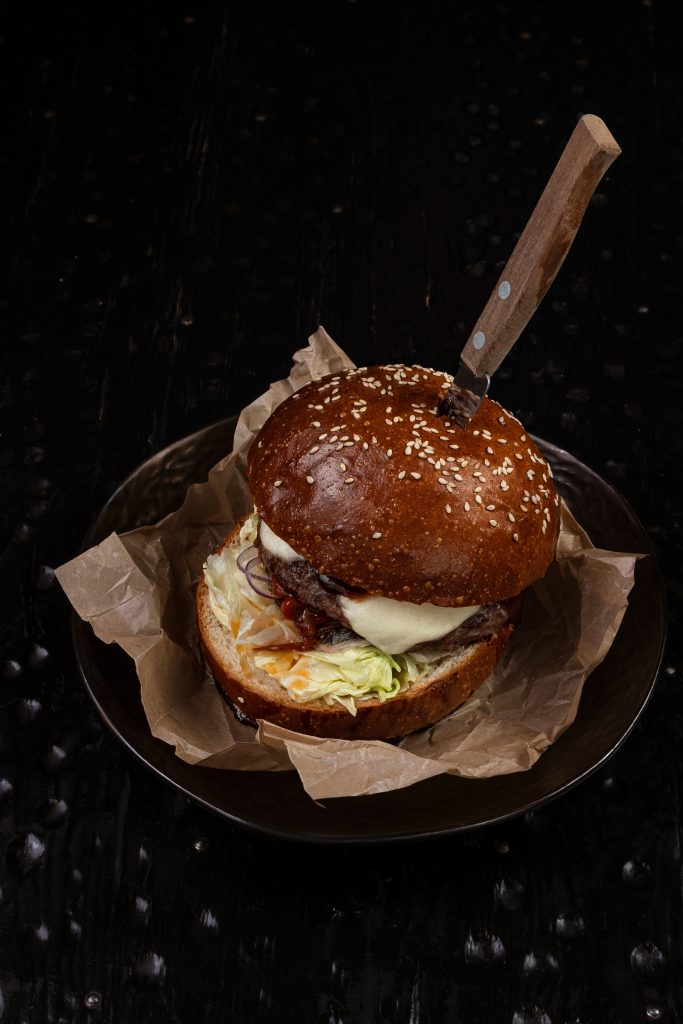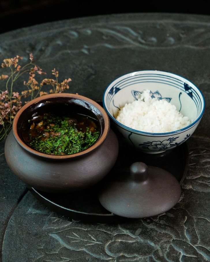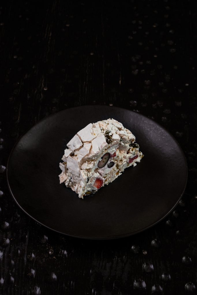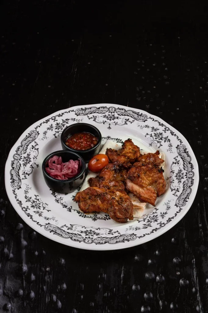 Мраморный стейк нарезается мелкими кубиками и заправляется имбирно-устричным дрессингом с зеленым луком. Блюдо посыпается тертым пармезаном и подается с домашней чиабаттой, обжаренной на гриле.