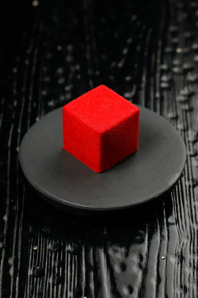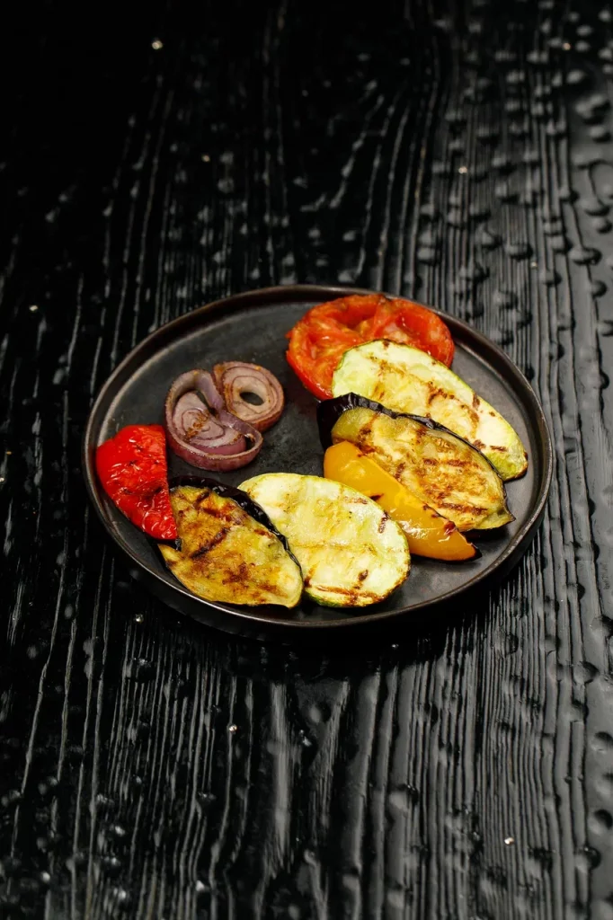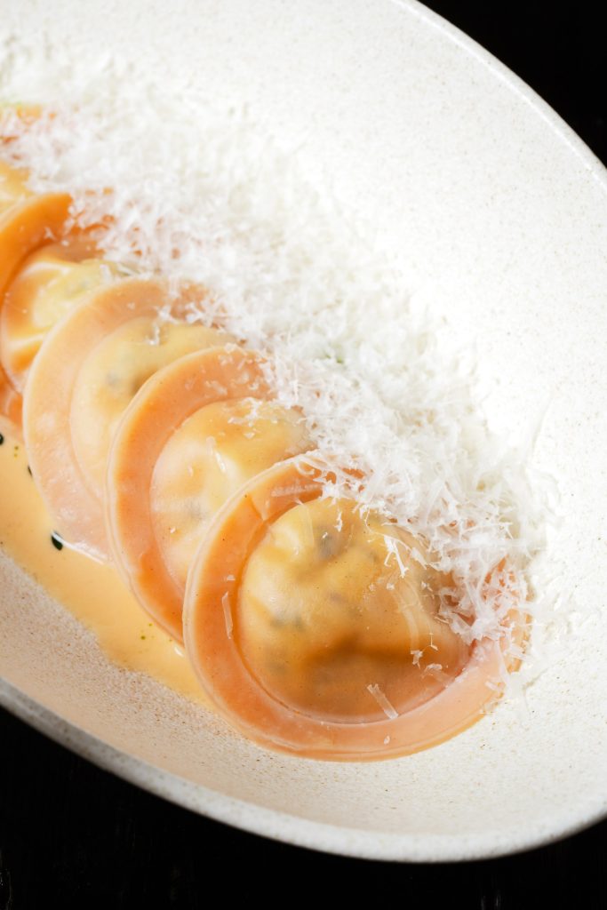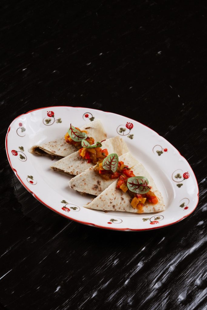 Перец нарезают, намазывают крем-чизом и закручивают в рулетики. На тарелку выливают чесночный соус, укладывают рулетики и смазывают имбирно-устричным дресингом. Завершается посыпкой тертым пармезаном.