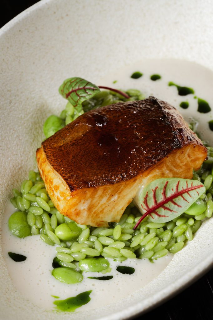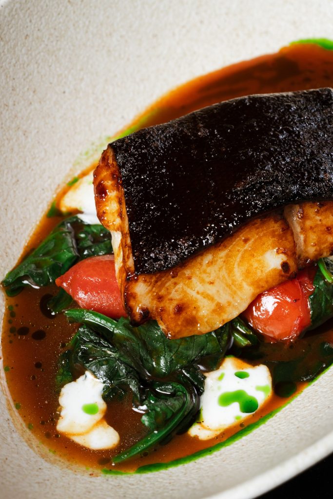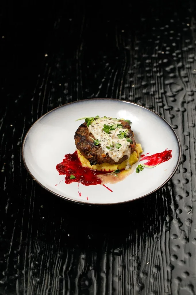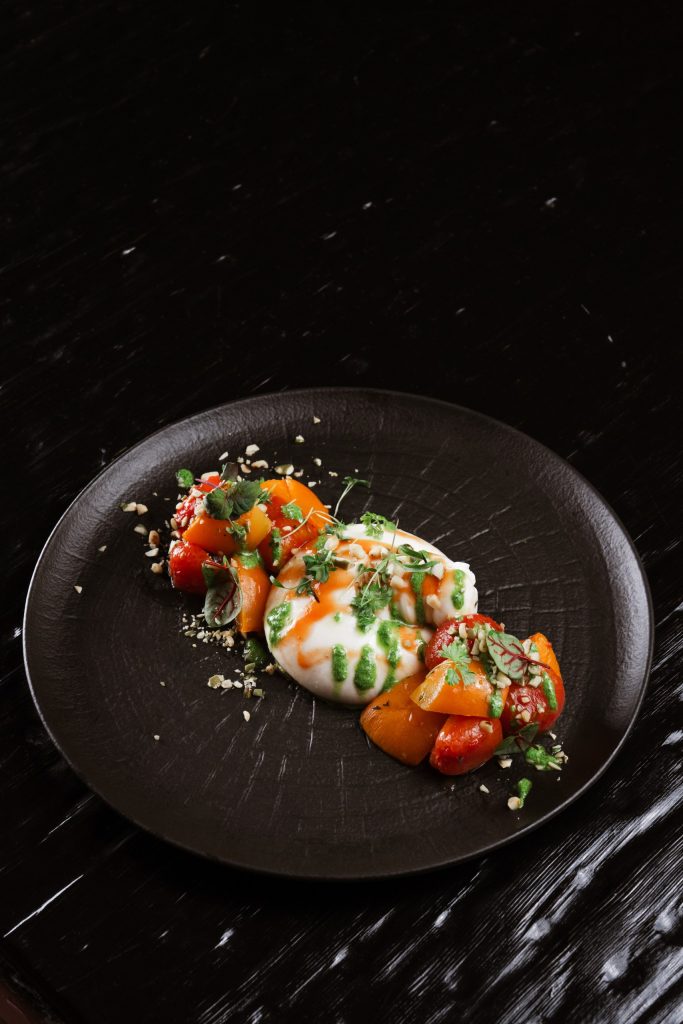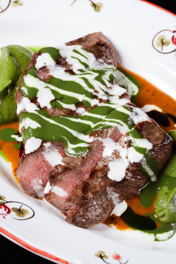 Хрустящая фокачча, нежно покрытая ярким песто из петрушки, становится идеальной основой для соте из запеченных овощей. На ней выкладывается сочный ростбиф из мраморной говядины. Украшается точками из крема феты и зеленого масла.