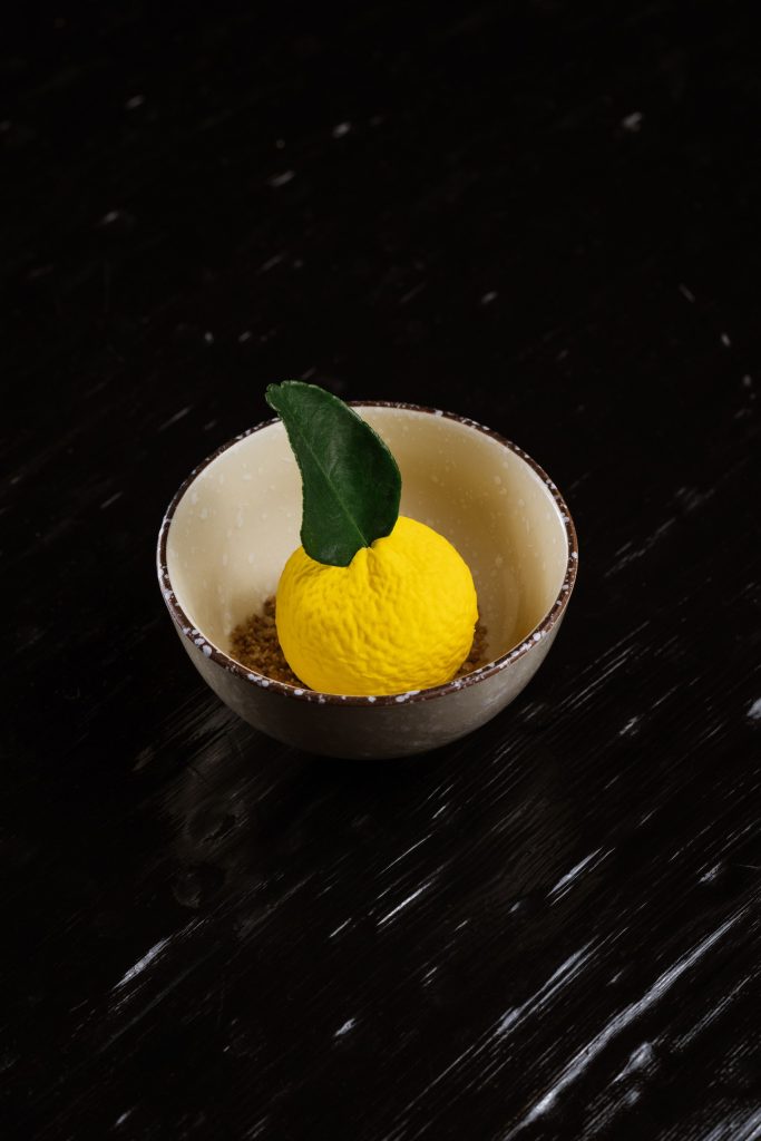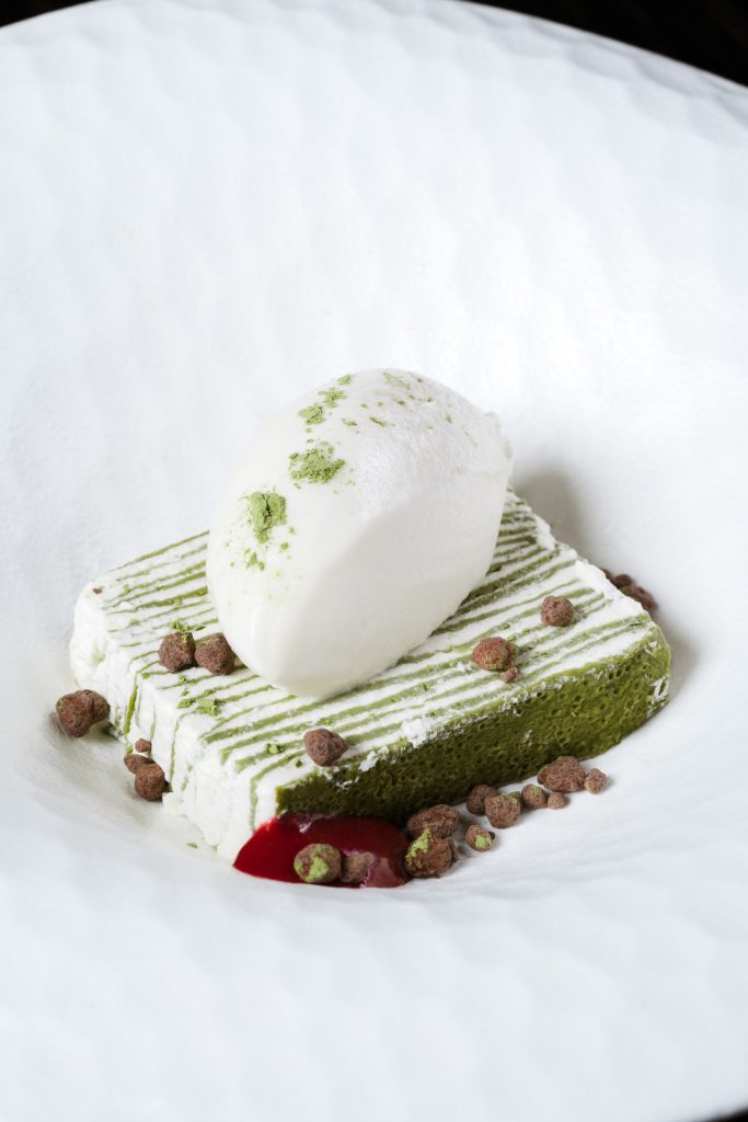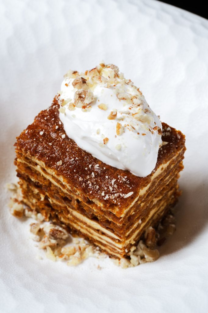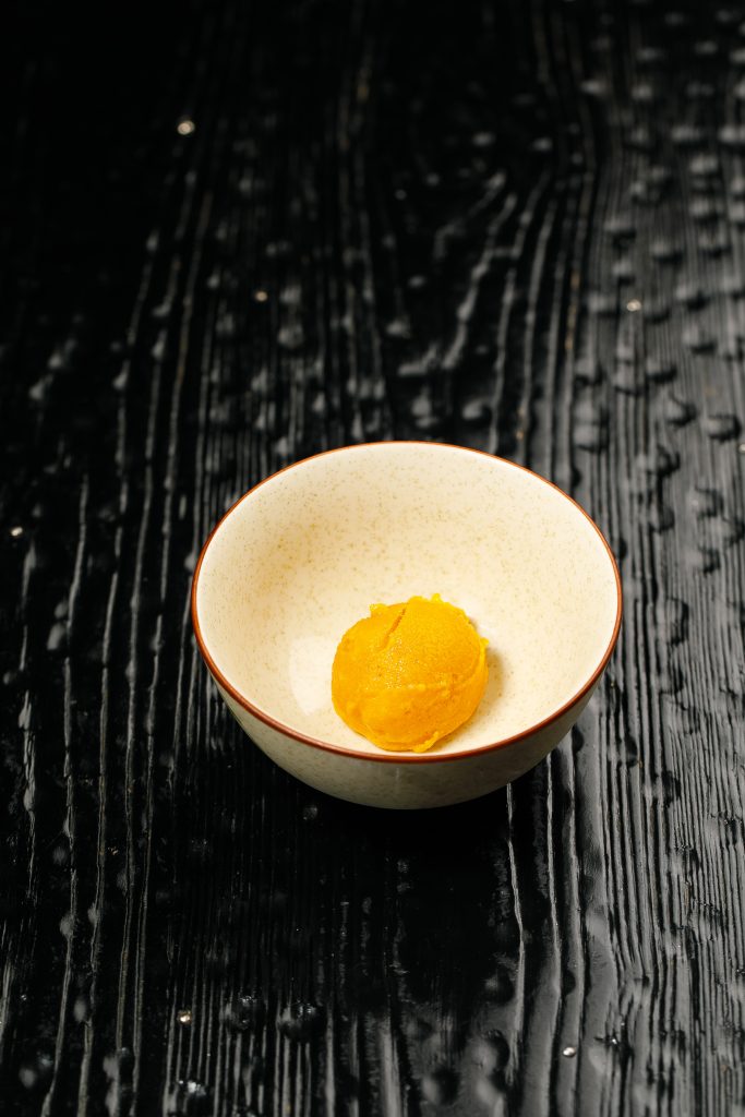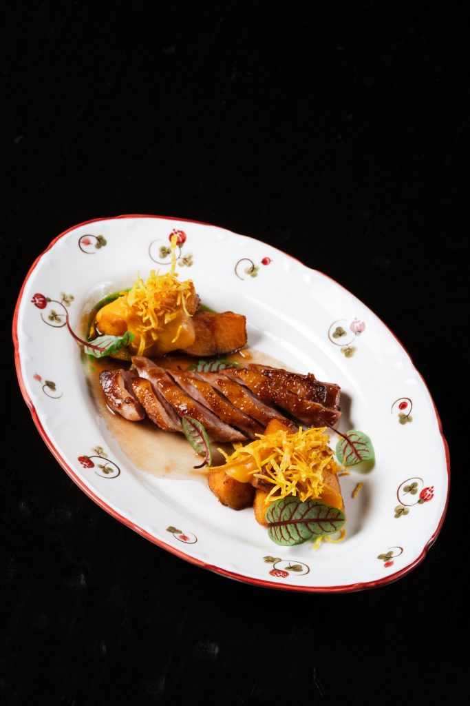 Нежный паштет из мяса и печени. Его верхняя часть украшена мостардой из груши, придающей блюду сладковато-пикантный акцент. В дополнение поджаренные тосты хокайдо.