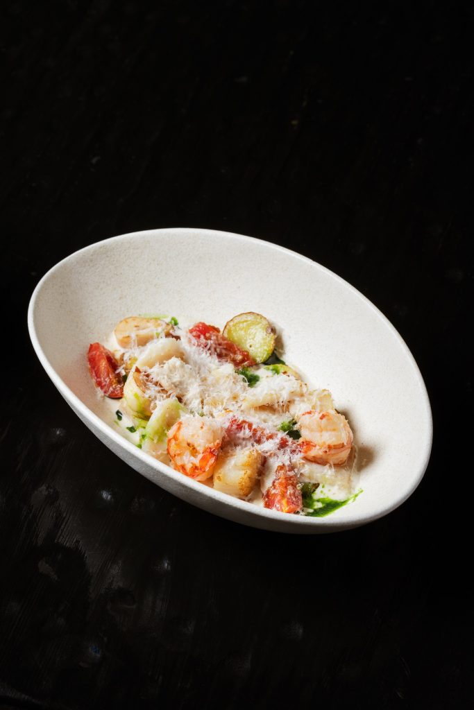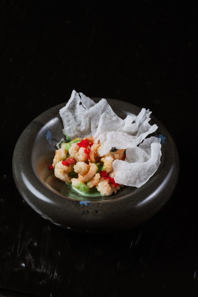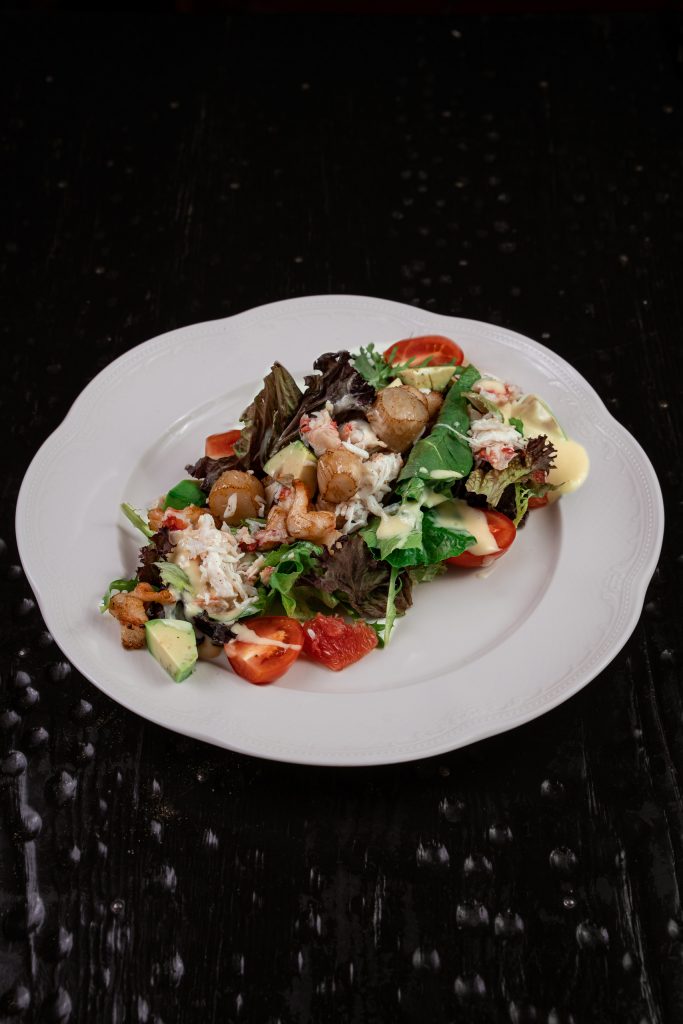 На хрустящей фокачче, щедро намазанной сливочным кремчиз выкладываются слайсы авокадо. Обжаренные до золотистой корочки креветки, нарезанные мелким кубиком, соединяются с нежным крабом, устричным соусом и айоли. Все это укладывается на авокадо и щедро заправляется зеленым маслом.