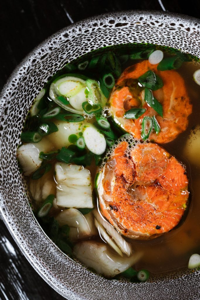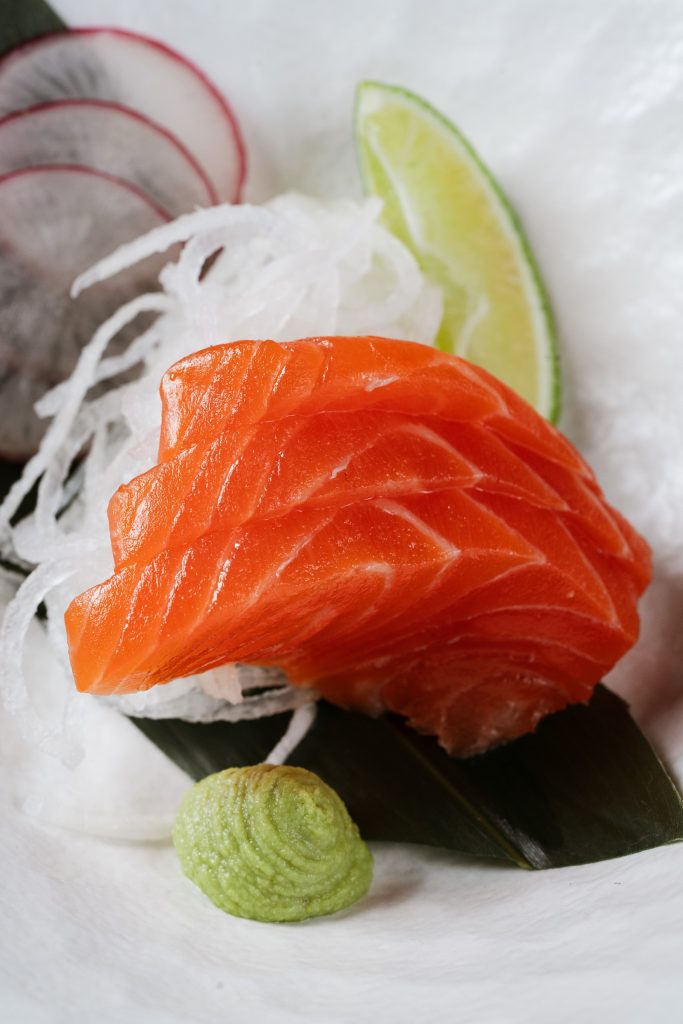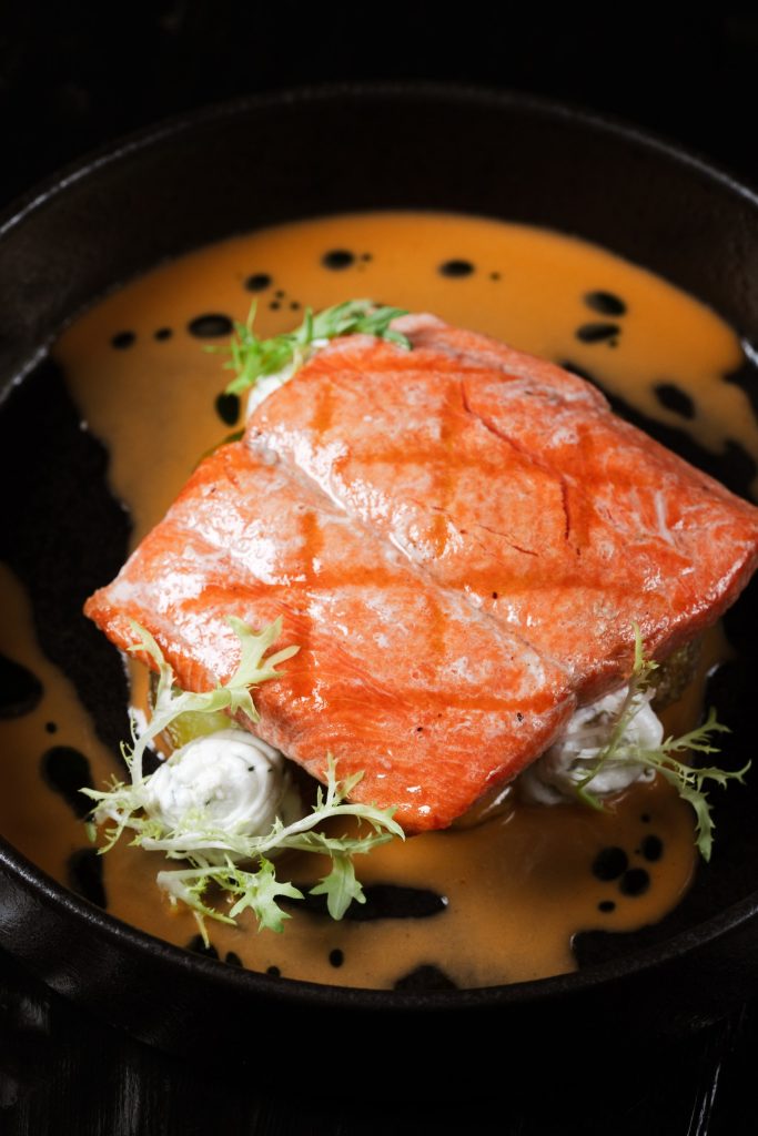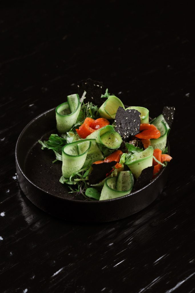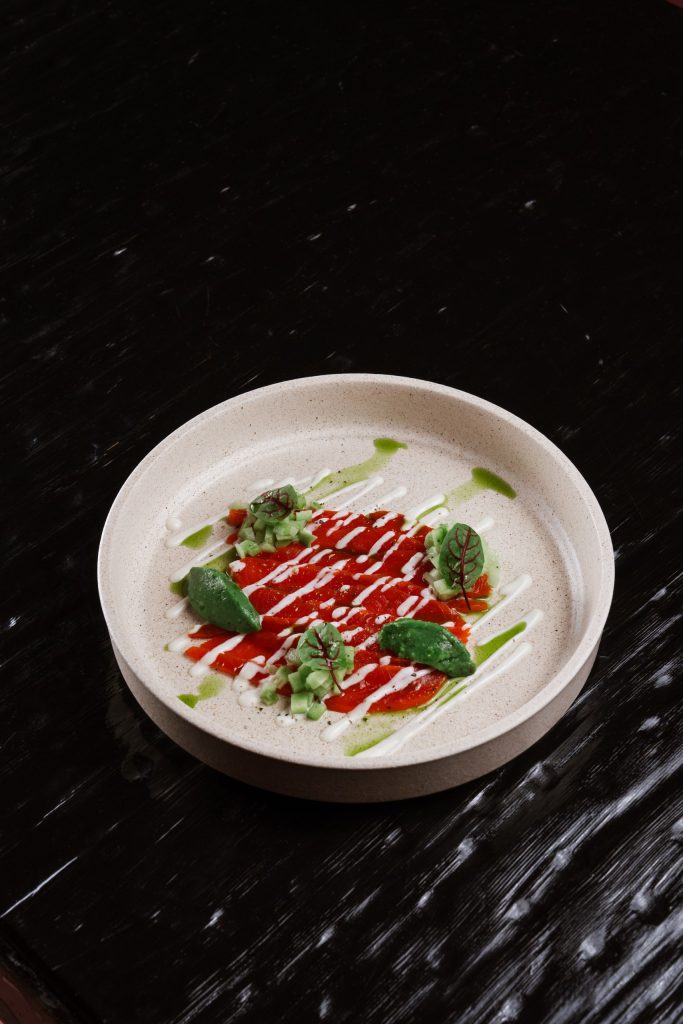 Тонкие слайсы слегка подсоленной нерки, выловленной у местных берегов, подаём с азиатской заправкой на основе зёрен горчицы. Для свежести добавляем гуакамоле и тартар из свежего огурца.