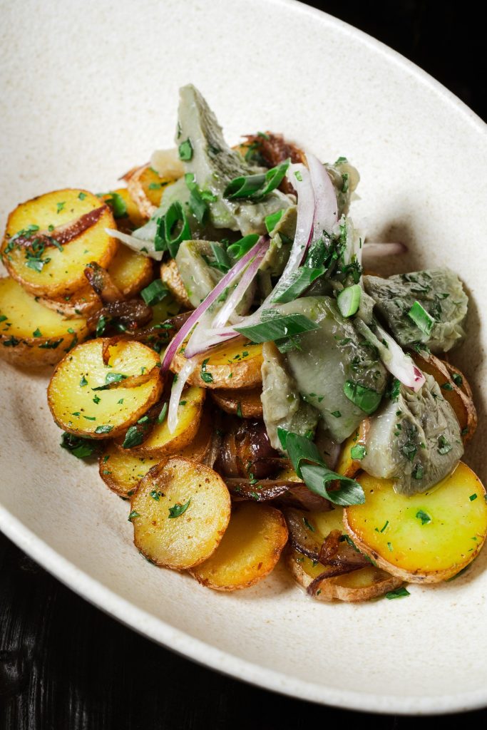 Сельдь слабой соли с картофелем, маринованным луком, зеленью, соусом из дальневосточного щавеля, соусом хондаши и соусом айоли.