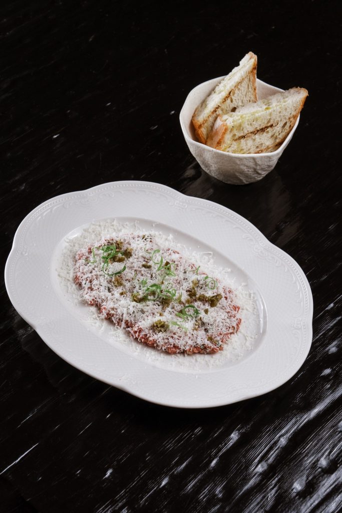 Тартар из говядины с пармезаном и хлебом на гриле